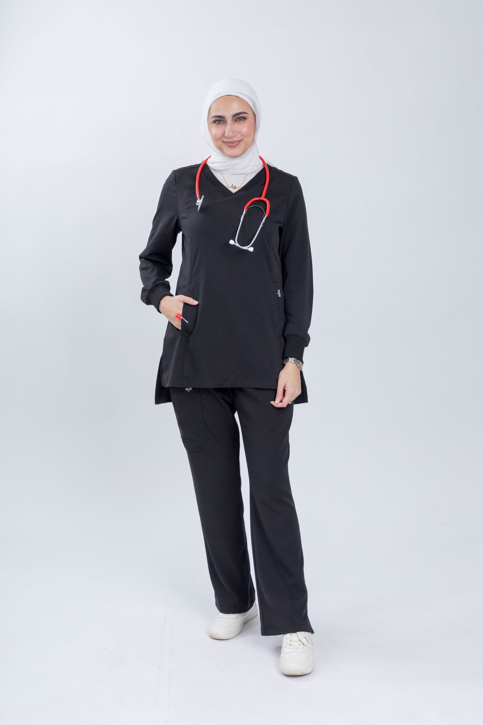 يتميّز التصميم بـ قصّات طولية ناعمة، وأساور مرنة، فتحات جانبية مدروسة تتيح حرية الحركة مع الحفاظ على شكل منظم ومتقن. كما يوفّر القماش عالي الأداء تهوية ومرونة وثباتاً في الشكل ليبقى المظهر أنيقاً طوال يوم العمل.