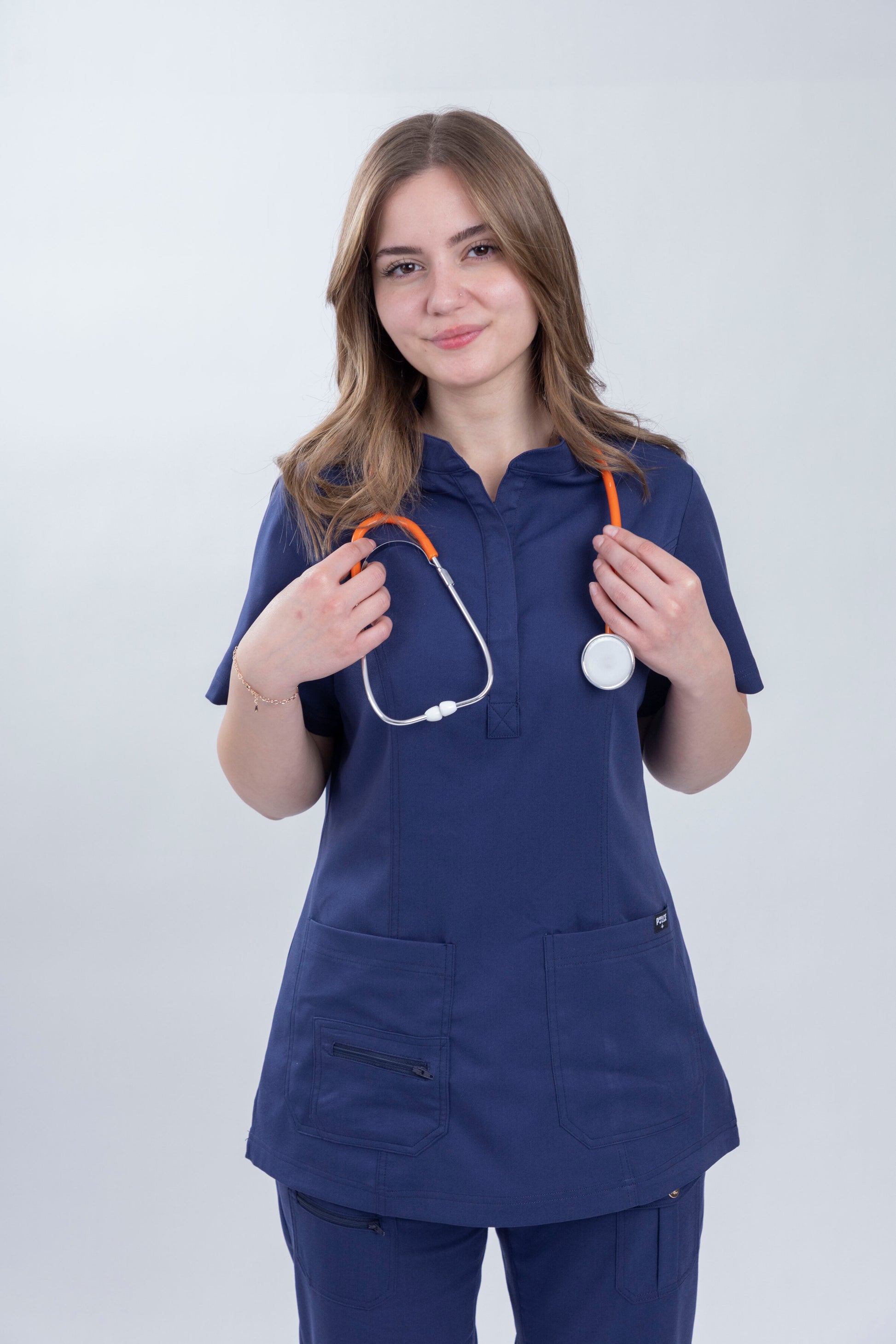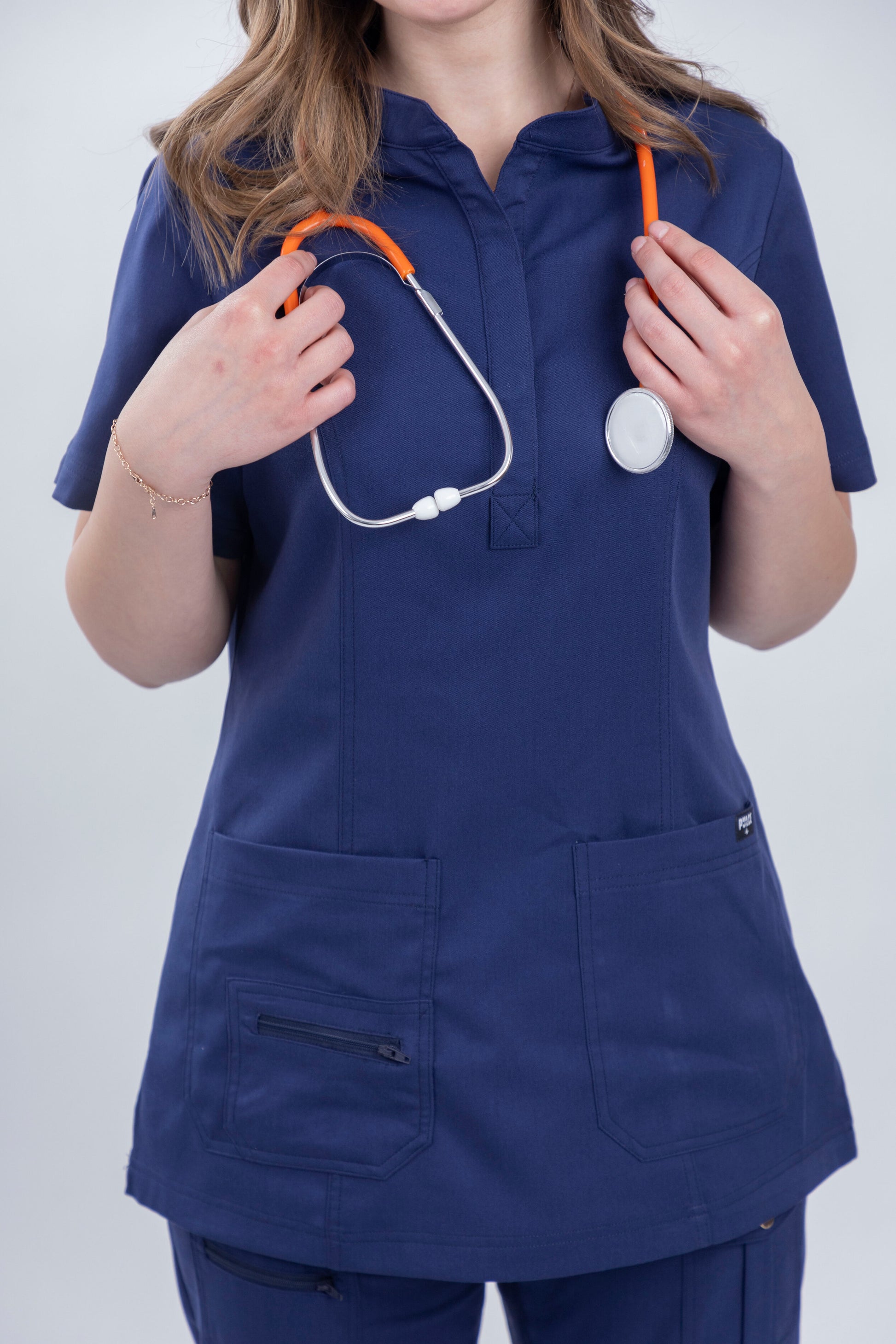 Embrace the calming essence of Deep Sea Blue scrubs from the Ram & Rom Series. This sophisticated navy shade exudes tranquility and professionalism, making it a timeless choice for those who value elegance and reliability in their workwear. The Ram scrubs, featuring short sleeves, offer a lightweight and contemporary style, while the Rom scrubs, with long sleeves, provide additional coverage and versatility to suit diverse professional needs. Crafted with soft, stretchy fabric, these scrubs ensure effortless movement and comfort throughout your busy workday. Perfectly blending style and functionality, Deep Sea Blue scrubs cater to a wide range of professional styles with grace and practicality.