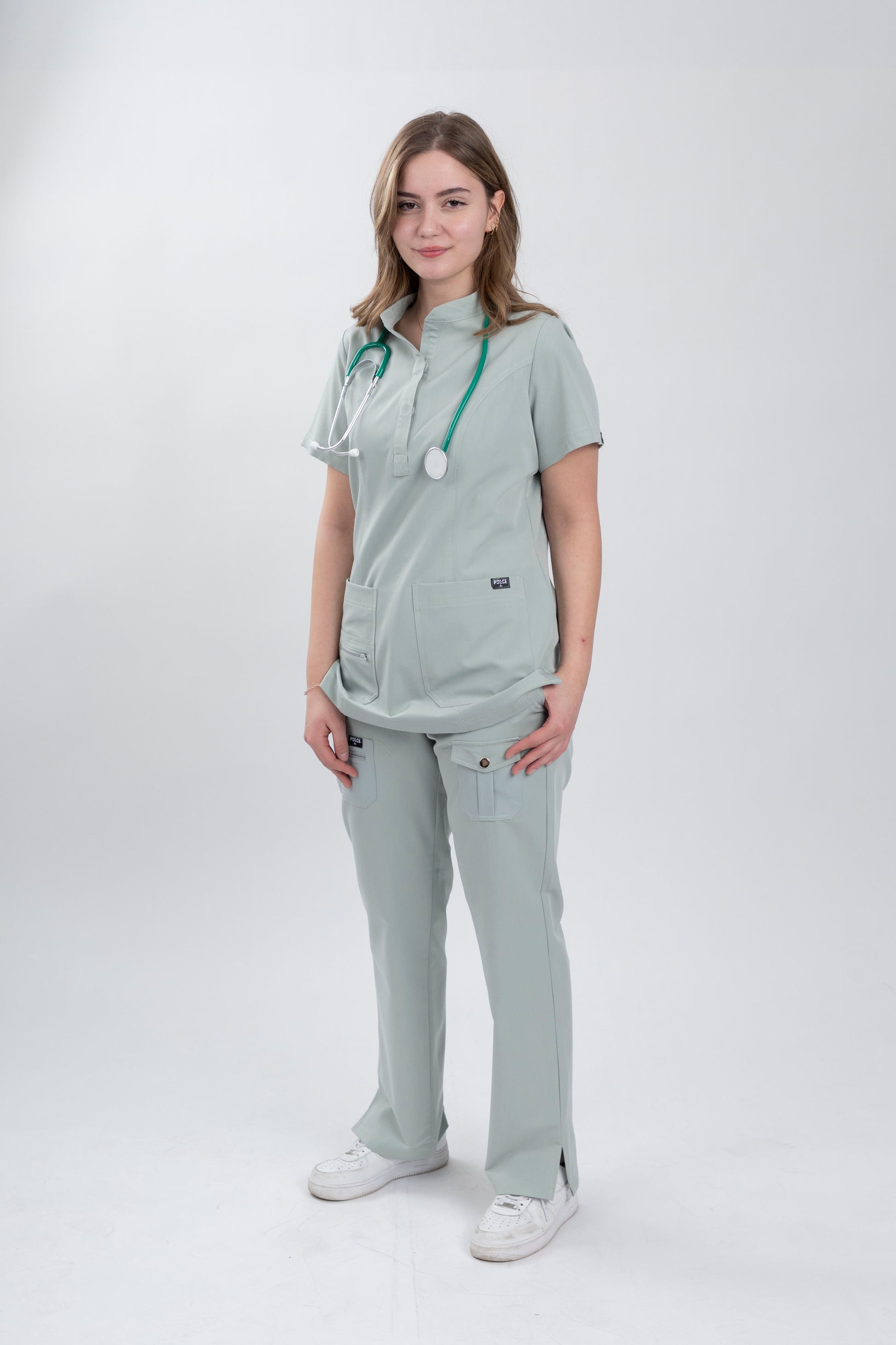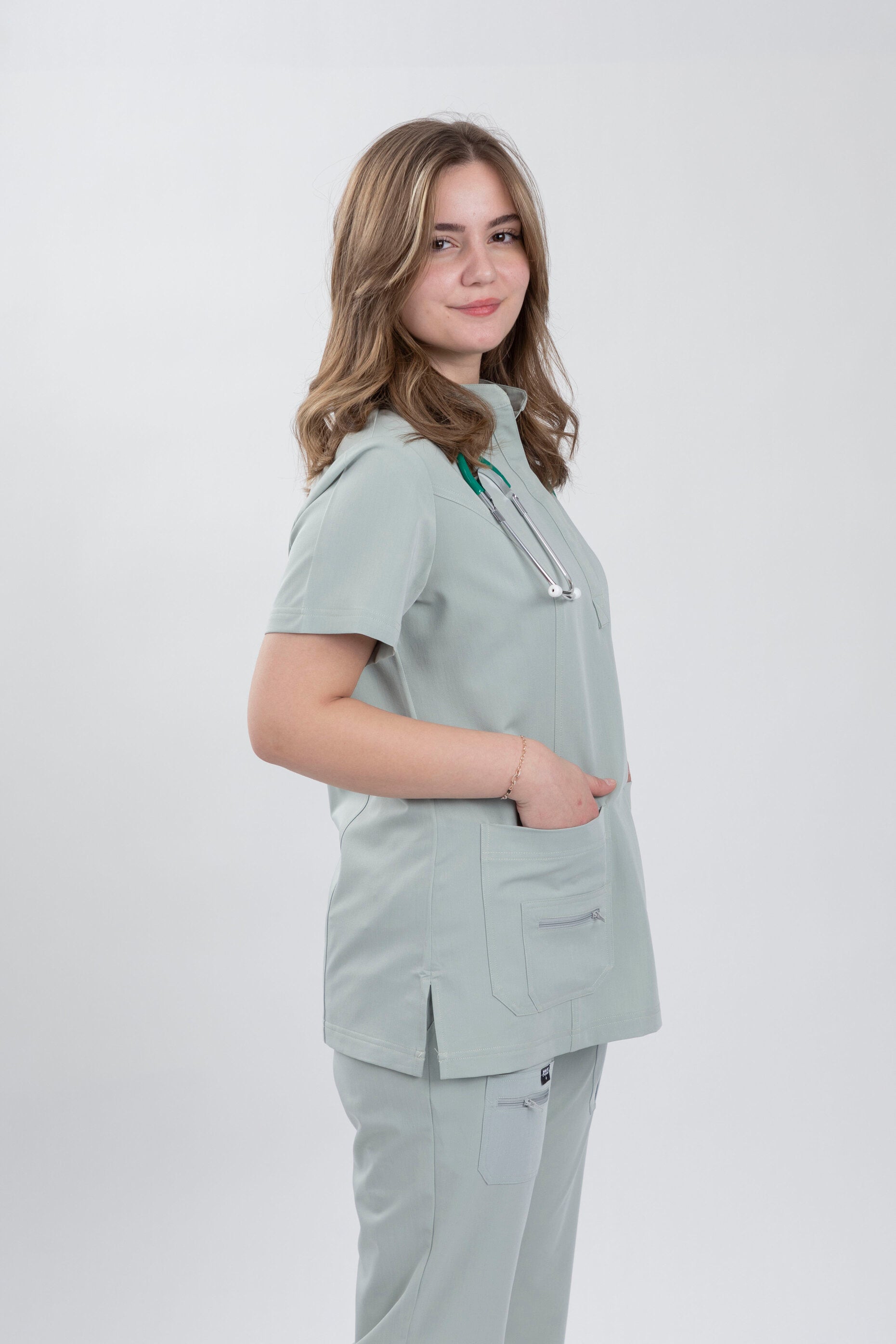 Experience the refreshing elegance of Teal Mint scrubs from the Ram & Rom Series. This serene and versatile mint hue represents professionalism and a modern aesthetic, making it a perfect choice for diverse medical professionals. The Ram scrubs, with their short sleeves, offer a lightweight and contemporary style, while the Rom scrubs provide long sleeves for added coverage and adaptability, ensuring every professional finds their perfect fit. Crafted from soft, stretchy fabric, these scrubs are tailored for comfort and seamless movement throughout your busy day. Whether you're working in high-paced environments or handling detailed tasks, the Teal Mint scrubs blend functionality and fashion effortlessly.