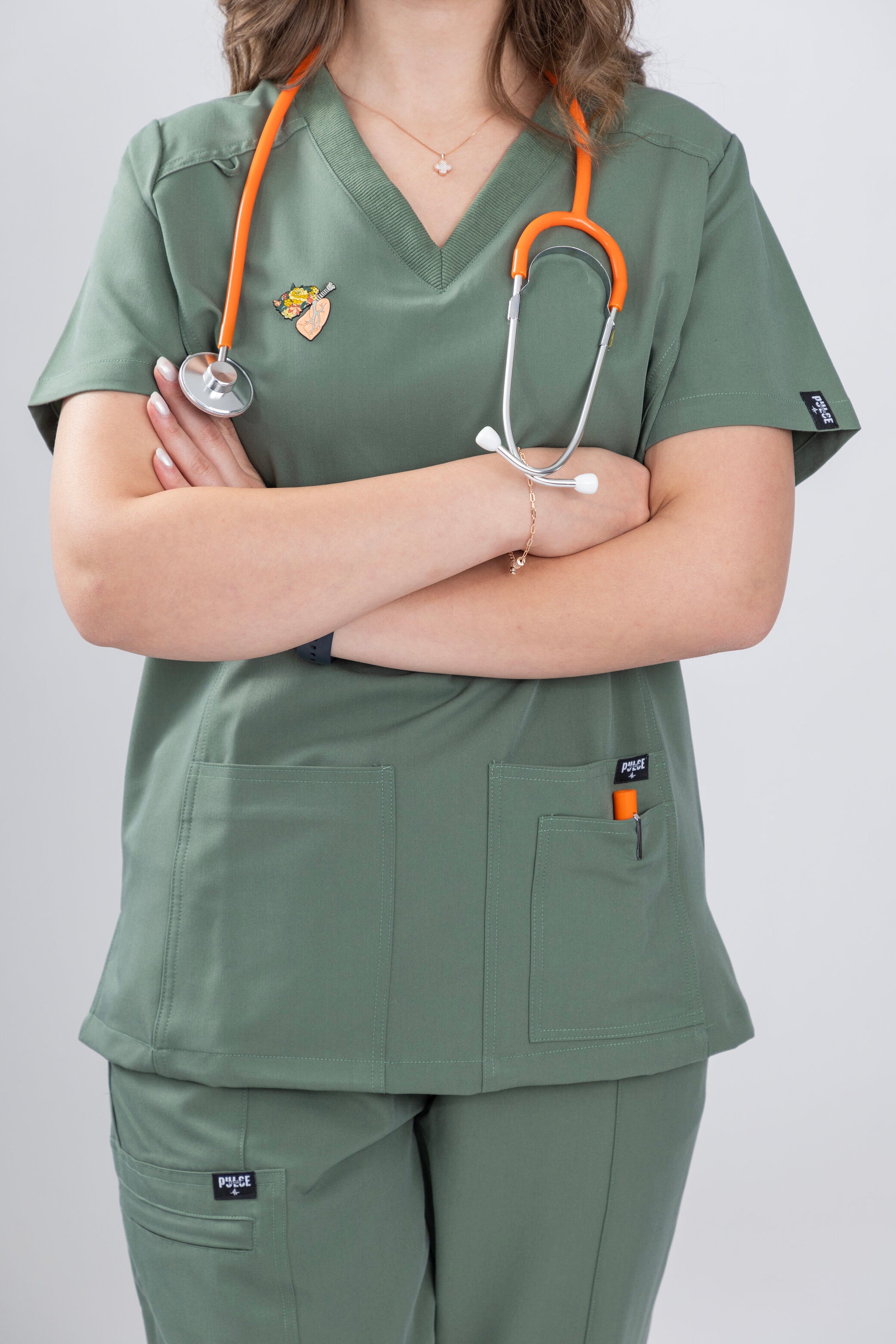 Embrace timeless sophistication with our Olive Green scrubs from the Universal Elegance Series. This rich green hue exudes versatility and understated elegance, making it a staple in your international professional wardrobe. Tailored for both style and comfort, the short-sleeved design adds a contemporary touch to the classic medical scrubs uniform. The high-end fabric ensures a luxurious feel, while the internationally inspired sizing guarantees a perfect fit. Elevate your work attire with the enduring charm of Olive Green, where functionality seamlessly meets fashion.